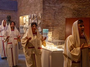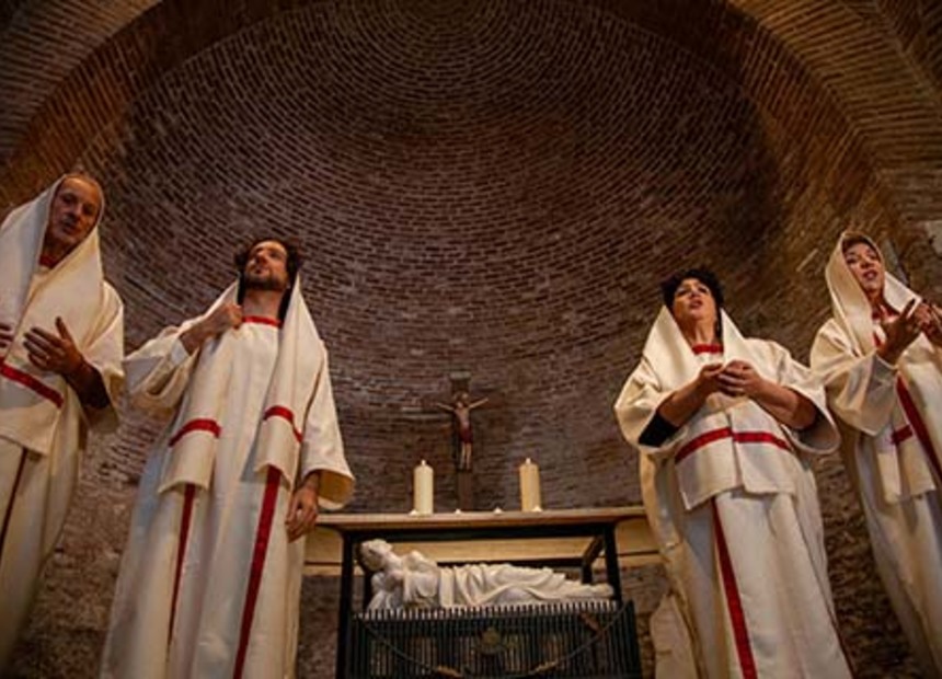 Experience a unique opportunity in Rome during the Jubilee year, exclusively at the Catacombs of Saint Callixtus, made possible by a special concession from the Vatican. You will have the chance to listen to the chants of the early Christians performed by our historically informed ensemble, dressed as they were in the early centuries of Christianity. The musical performance will be held in the Tricora, a small basilica reserved for our event, located next to the entrance of the catacombs, which houses significant paleochristian artifacts.