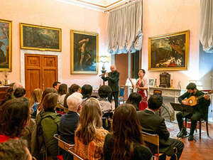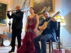 Our carefully curated repertoire takes our guests on an auditory exploration through Italy’s rich musical tradition, with compositions that resonate with the very essence of the country’s storied history. The evening’s performance, led by a sublime soprano whose voice is as captivating as the narratives woven into each aria, is complemented by the melodic whispers of a transverse flute and the resonant strumming of a baroque guitar. The deep, sonorous plucks of the theorbo add a layer of baroque richness, creating a multi-sensory tribute to the Italian masters of melody.